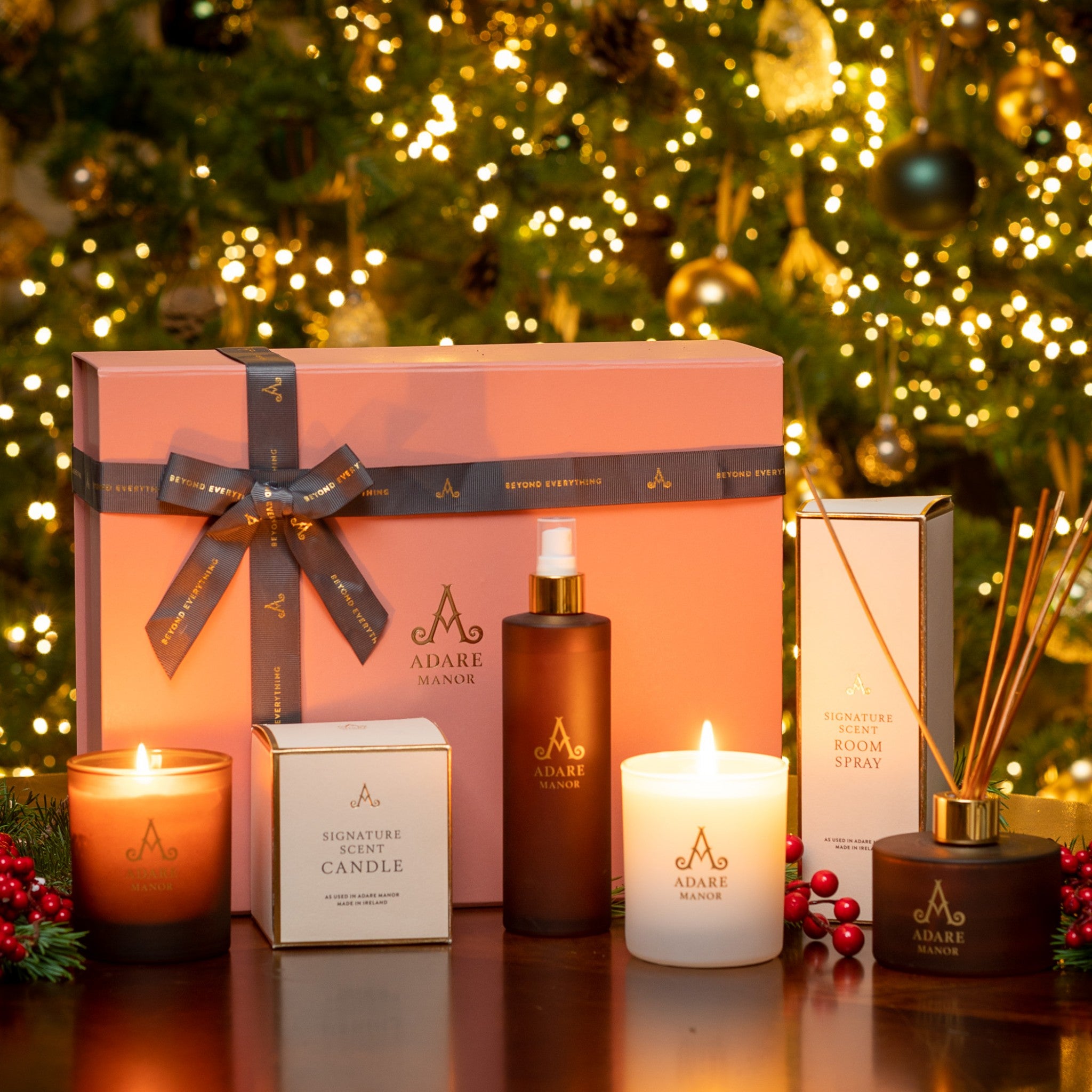 Your gift box will be presented in an Adare Manor presentation box and ribbon and will include: One Adare Manor signature scent one wick candle, one Adare Manor exclusive Woodland Walk one wick candle, one Adare Manor signature scent diffuser and one Adare Manor signature scent linen spray.